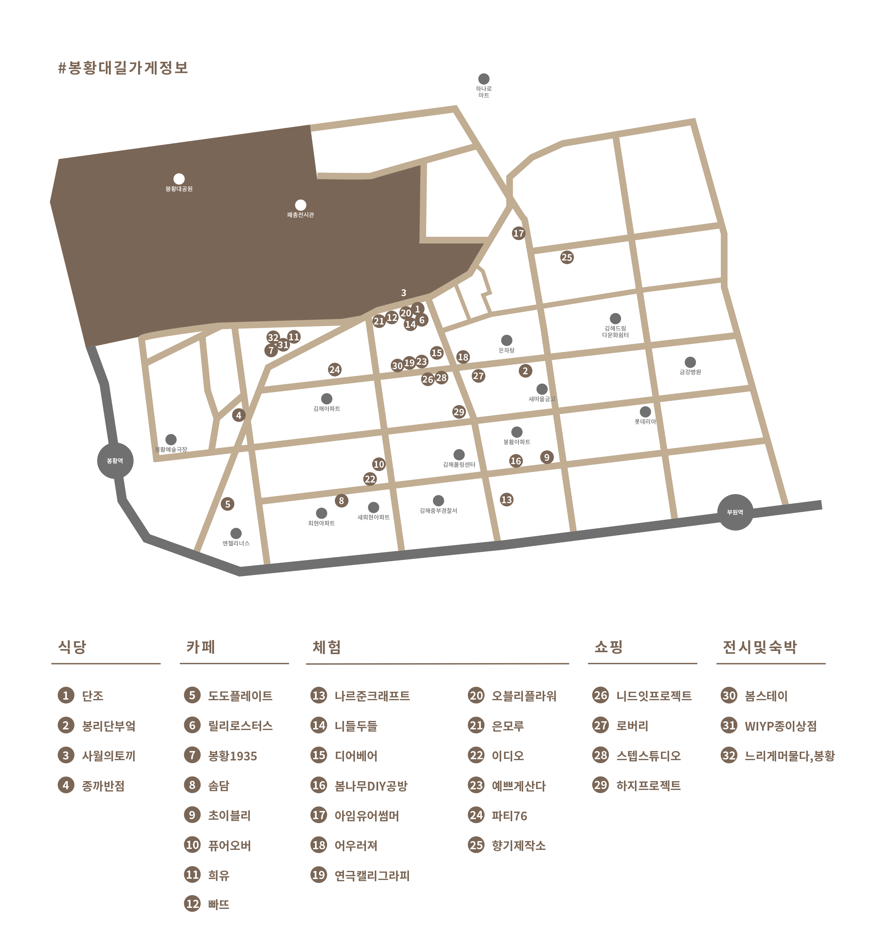 ‘김해의 연남동’이라고 불릴 만큼 감성적인 분위기를 자랑하는 봉황대길(구. 봉리단길)은 연인들과 친구들 사이에서 핫한 플레이스입니다. 처음 봉황대길에 와 본 사람들은 평범한 거리의 모습에 순간 당황할 수 있는데 편안한 마음으로 거리를 조금만 걷다 보면 아기자기하게 꾸며진 카페와 음식점, 옷가게 등 봉황대길만의 특색 있는 가게를 만날 수 있습니다. 벽화 골목과 소품 가게, 감각적인 레스토랑과 카페가 밀집해 있어 인생샷 남기기에도 제격입니다.