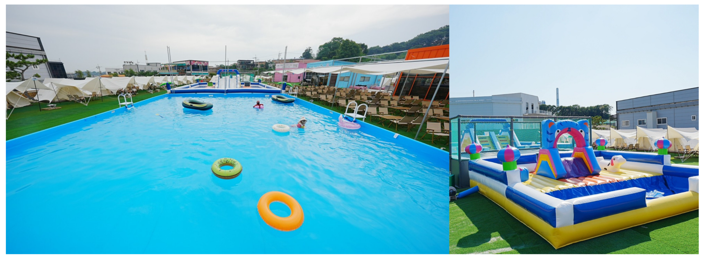 - 물놀이장 구성: 대형 슬라이드 풀, 유아풀, 튜브 이용 공간, 워터건, 구명조끼 제공 등