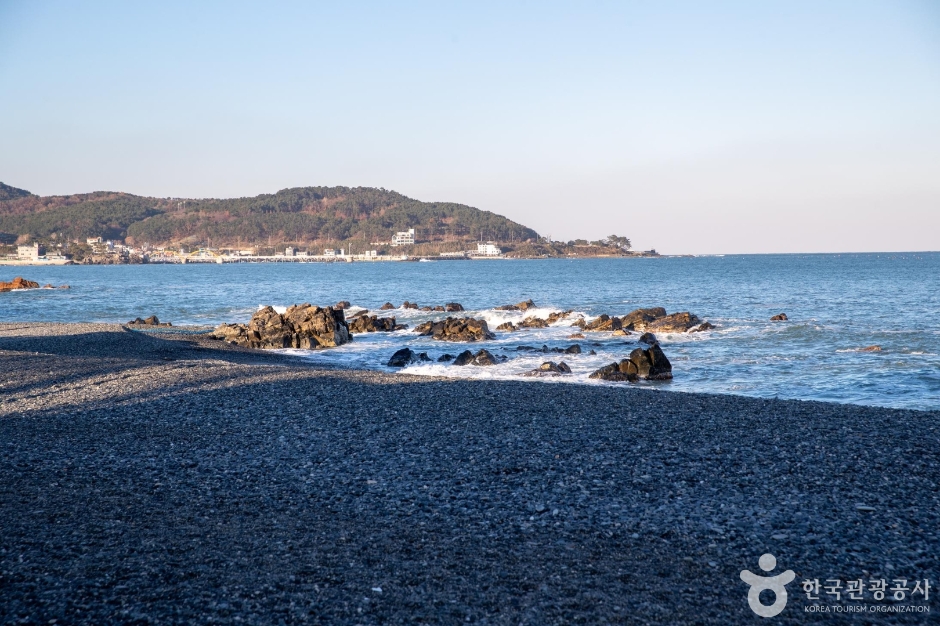 몽돌은 모가 나지 않은 둥근돌을 말하는데, 동글동글한 까만 몽돌이 해안에 길게 늘어져 있어, 절경을 이루고 있습니다. 다만, 몽돌 특성상 백사장보다 발이 아플 수 있으므로 아쿠아슈즈 필수입니다. 물은 맑고 파도 소리에 몽돌이 굴러가는 소리가 더해져 자연 그대로의 힐링을 경험할 수 있어요.