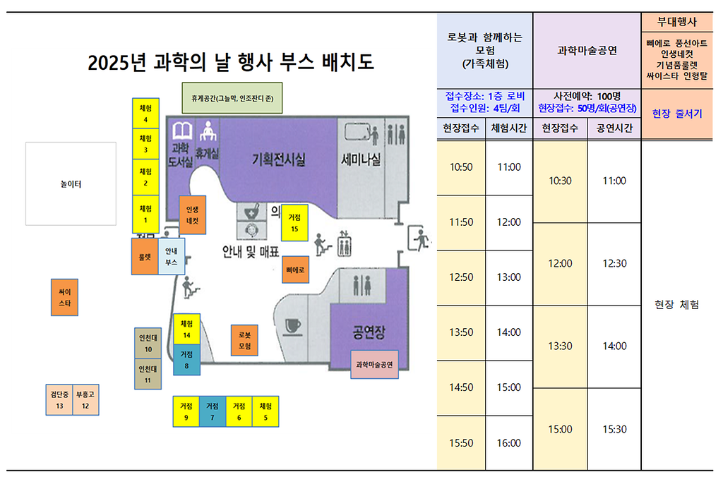 → 인천어린이과학관 홈페이지 사전접수 마감. 현장접수 시간(공연시작 30분 전)을 확인. - 체험 부스는 현장 선착순 접수로 운영됩니다. 성인 1명당 어린이 3명까지 신청 가능합니다.